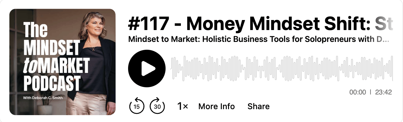 {TLDR: Listen for a Money Mindset Exercise] Hey there Reader! This email might completely shift how you think about your work and your pricing. (I know... Big Claims! But that's exactly what happened for me) I knew I should share this exercise because: Most women entrepreneurs are still WILDLY undercharging for their work. Spoiler: It's not because they're not as good as men at their jobs. 🙄 Often, you’re undercharging because you’re not fully seeing the value of what you do. So instead of just talking about it… I want to give you a simple exercise you can do right now. (If you want to do this with me, click here to listen and follow along) And, so you can revisit this any time, here are the steps: ✍🏻 A Money Mindset Exercise to See Your True ValueGrab a notebook (or open your notes app) and follow this: Step 1: What problem do you solve for your clients?Go deeper than the surface here. What is your client really struggling with? Step 2: How does solving this impact their money?→ Do they make more income? (Every business can answer this, even if you don't help people make money) Step 3: How does it impact their health and well-being?→ Less stress? Step 4: How does it impact their relationships?→ More presence with family? Step 5: Who do they become in the future?→ More confident? Now take a minute to reflect... Look at everything you wrote down. THIS is the true value of your work. Not the amount of time you spent The transformation. And when you start pricing from that place… That's when it all changes. I go deeper into this on this week’s podcast episode, and I walk you through this step-by-step: 🎧 Listen here: Ep #117 - Money Mindset Shift: Stop Undervaluing Your Work (A Simple Exercise To Help You Charge More) And listen, I know pricing is difficult. If this exercise opened something up for you and you'd love a conversation about how to best price your current offers... Hit reply and let's set up a free 20-min call where I'll give you a few tips on how to take the best next step for your work. I'm here to help you align these pieces of your business so you can thrive! 💛 Deborah |